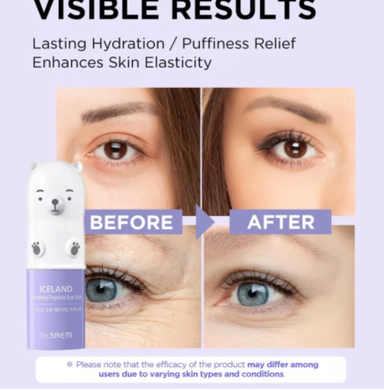Stick para ojos hidratante con péptidos de The Saem que nutre, hidrata y suaviza el contorno de los ojos. Aporta una sensación ligera y refrescante a tu piel a la vez que reduce la aparición de arrugas y líneas de expresión. Gracias al agua glacial islandesa refresca e hidrata la piel mientras que los péptidos estimulan la producción de colágeno a la vez que mejora la elasticidad y firmeza de la piel.