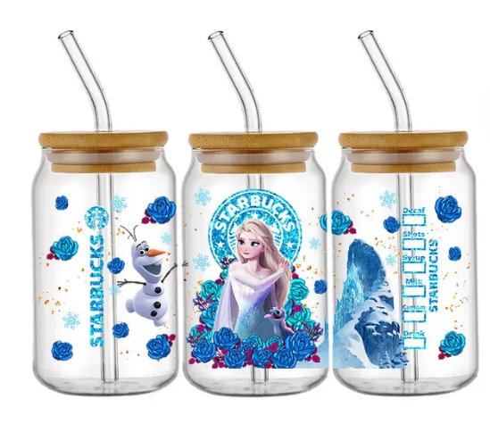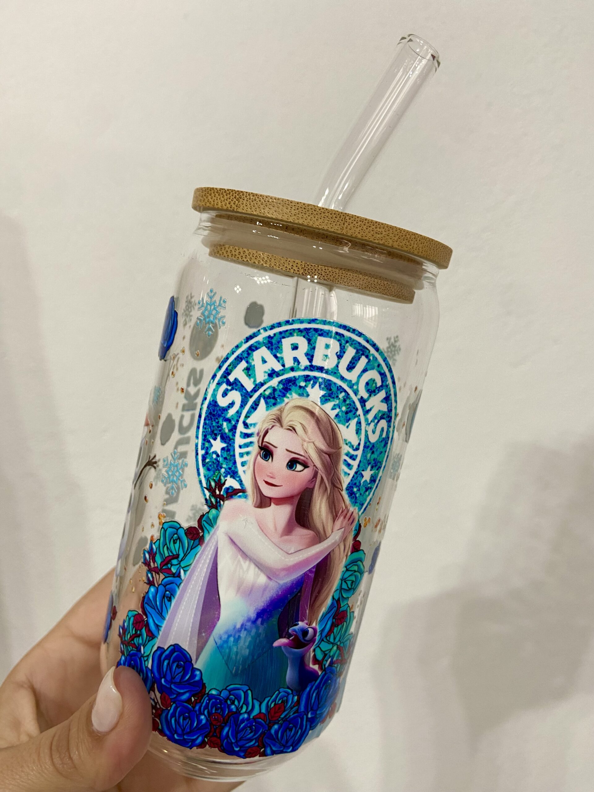 Taza de vidrio con tapa de bambú y pajita de vidrio