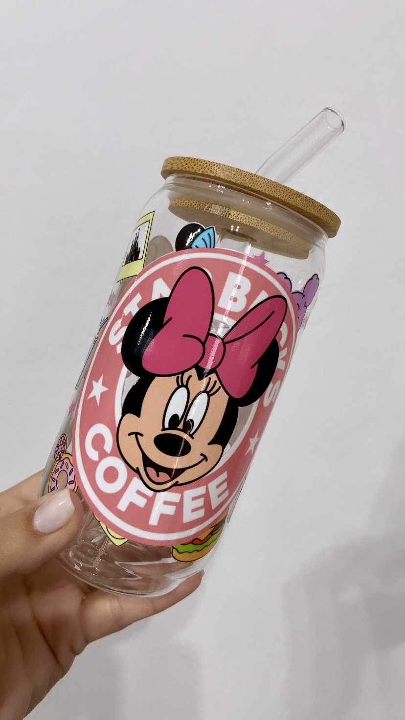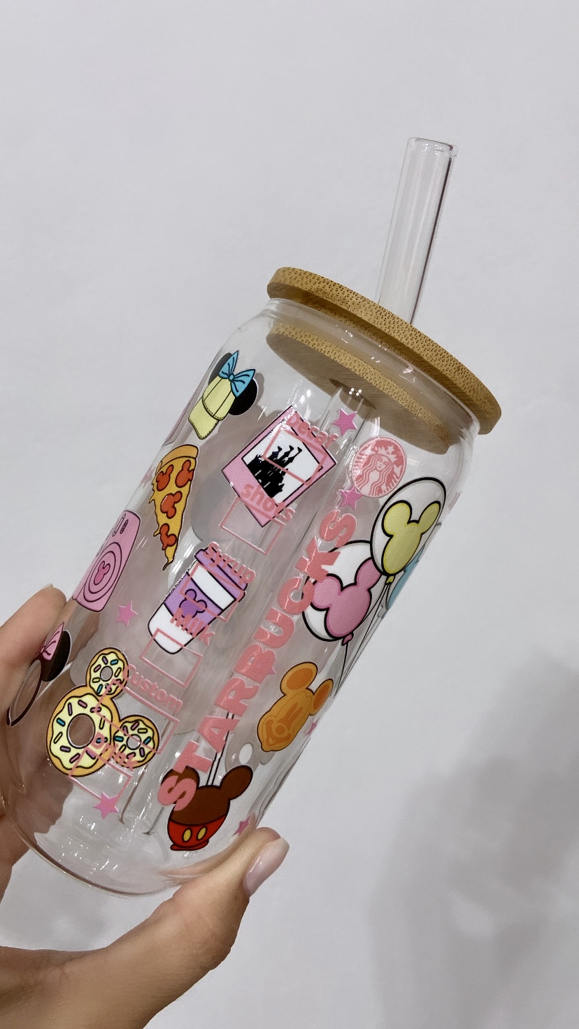 Taza de vidrio con tapa de bambú y pajita de vidrio