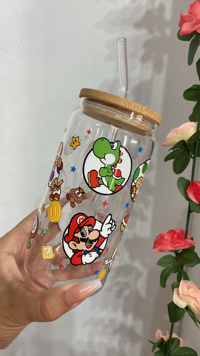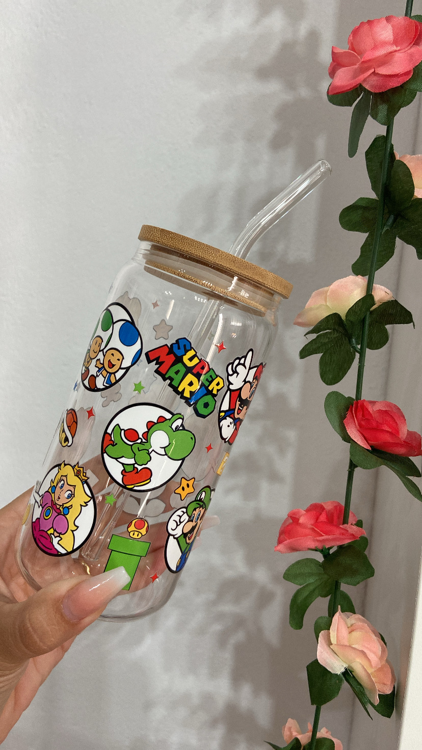 taza de vidrio con tapa de bambú y pajita de vidrio